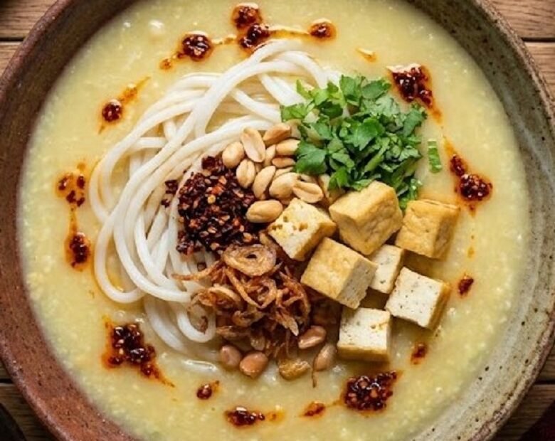 Tofu Nway is a comforting, warm dish from the Shan State of Myanmar (Burma). Despite the name, it contains no soy tofu. Instead, it is made from chickpea flour, slowly cooked into a smooth, silky porridge and served warm over rice noodles. It is topped… Read More »Tofu Nway – Shan Warm Chickpea Porridge with Rice Noodles