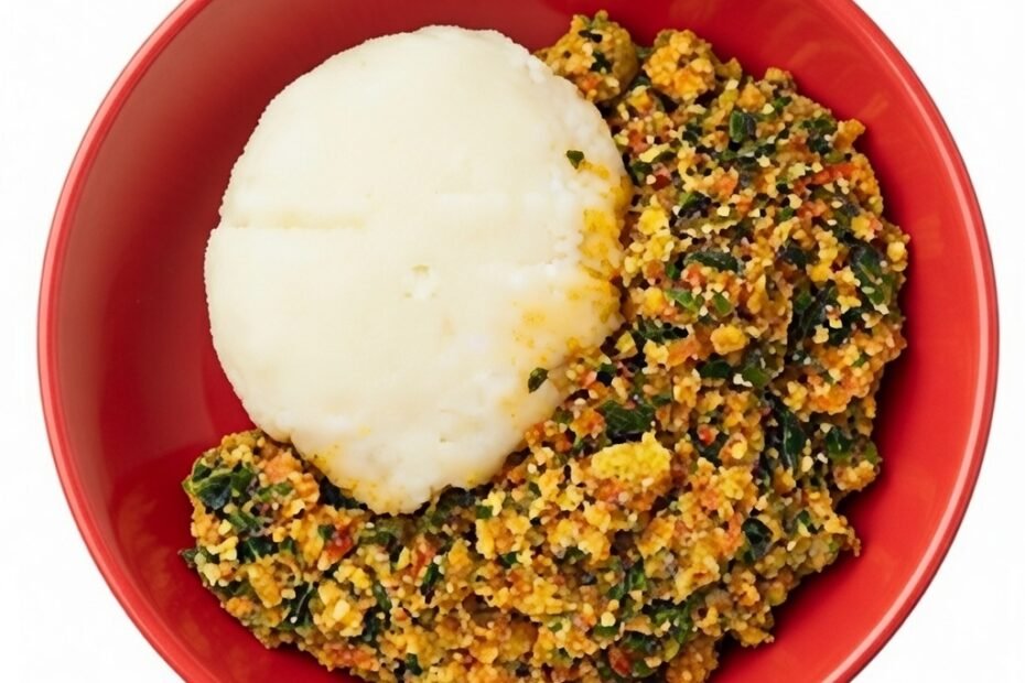 The dish combines soft, stretchy fufu made from pounded yam or cassava with a rich and flavorful egusi soup. Egusi soup is made from ground melon seeds cooked with vegetables, meat or fish, and spices. Together, they create a balanced meal that is both filling and nourishing.